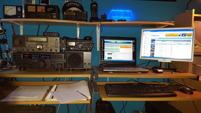Hieronder een foto van mijn bescheiden shack. Mijn voorliefde gaat uit naar apparatuur van Yaesu en antennes van Diamond. Dit is waarschijnlijk ontstaan omdat mijn eerste ontvanger in de jaren 80 van Yaesu was, maar Icom apparatuur vind ik ook heel mooi.